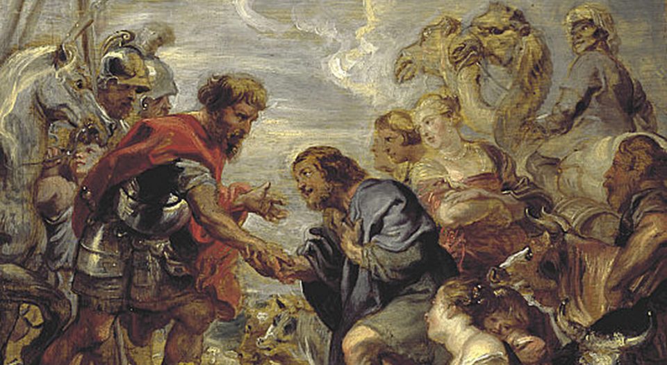 Twenty years pass. Jacob learns that Esau is galloping toward him with 400 men. He fearfully offers an honest foxhole prayer: “Deliver me, please, from the hand of my brother … for I’m afraid of him; he may come and kill us all” (32:11).