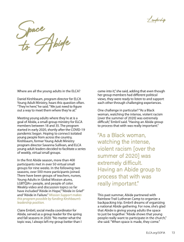 goal of Abide, a small-group ministry for ELCA members between 18 and 35 . The program started in early 2020, shortly after the COVID-19 pandemic began . Hoping to connect isolated young people from across the country, Kirshbaum, former Young Adult Ministry program director Savanna Sullivan, and ELCA young adult leaders decided to facilitate a series of weekly, virtual small groups .