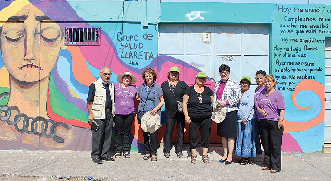 ELCA Presiding Bishop Elizabeth Eaton (fourth from right) stands with Chilean health promoters and ELCA staff in front of a local mural exposing the realities of violence against women. In December, Eaton and other ELCA leaders visited with members of the Educación Popular en Salud (Popular Education for Health) team and recently trained advocates for ending violence against women. Their ministry, which receives funding from the ELCA, has been responding to the health needs of marginalized communities in Chile for 35 years.