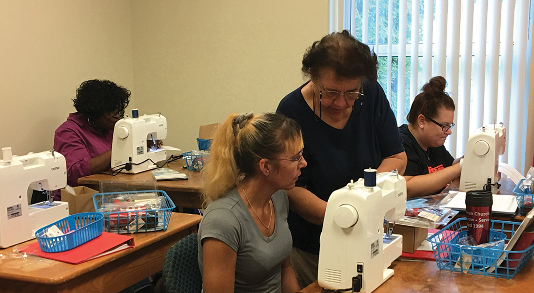 “If they can demonstrate a mastery of skills, they earn that sewing machine to take home and use for income, home decor, crafting or whatever,” she added. Mastery of skills includes attending classes, completing a project—making a backpack for people who are homeless—and writing a résumé. Job-search skill training and mock interviews are conducted by a church member with a human resources background.