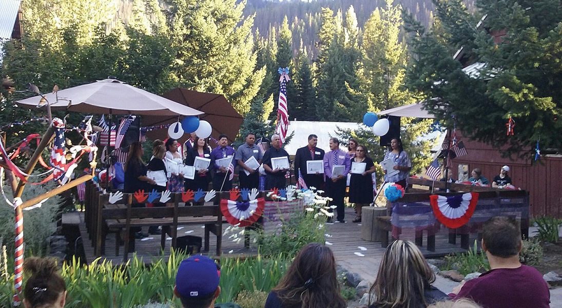 The new citizens took their oath of allegiance surrounded by mountains and a supportive crowd. Paula Swasko, former worship coordinator at Holden, sang the national anthem. Medic Dana Petersen played the bagpipes. Among the guest speakers was the Hurtados’ daughter, Yessica Patino Hurtado.