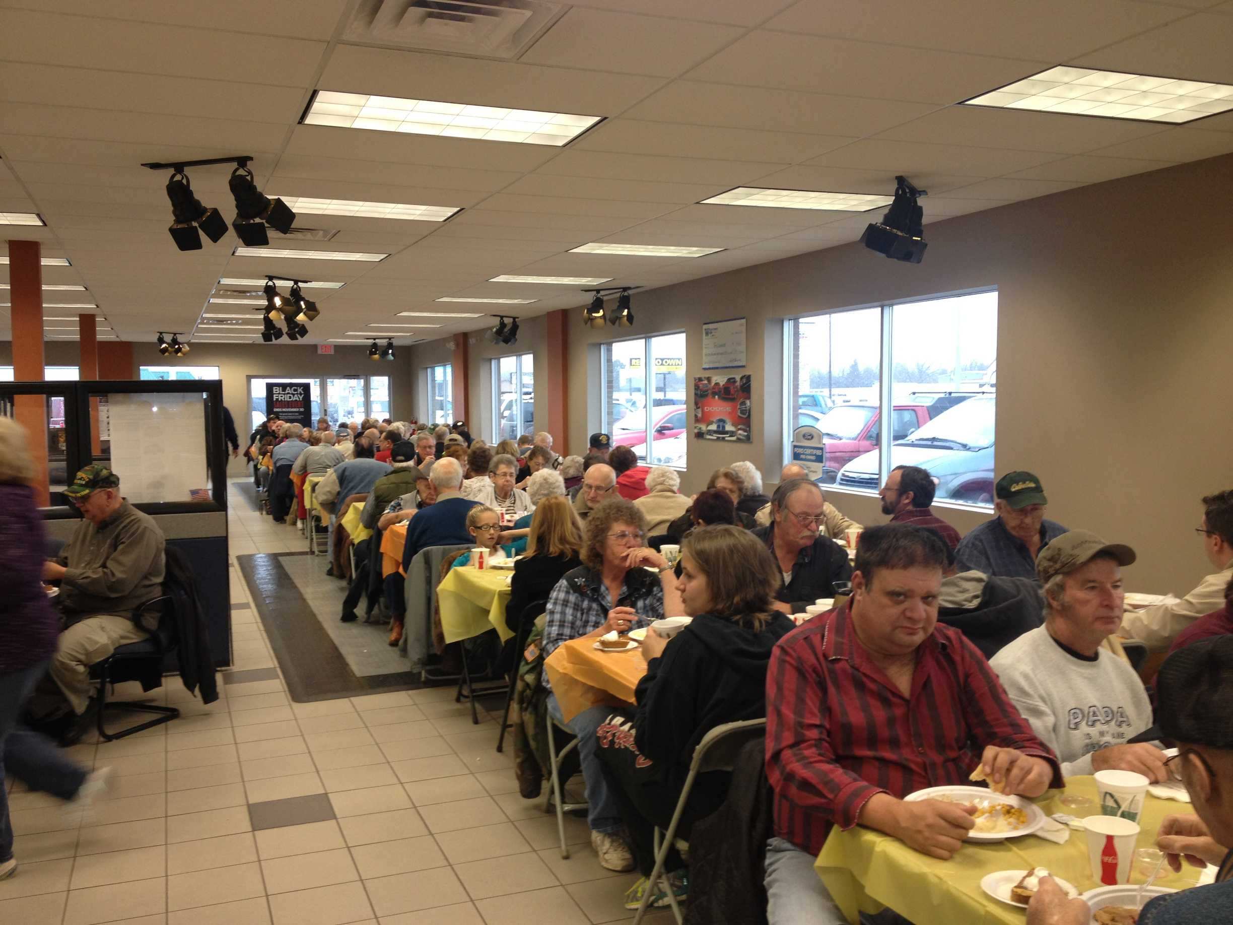 For 364 days of the year, the showroom at Watertown Ford Chrysler is the stage for polished, new models from the Ford, Lincoln, Chrysler, Dodge, Jeep and Ram lineups. On the 365th day, at least for the past 14 years, the showroom is emptied and transformed into a banquet hall where hundreds of guests dine on a free Thanksgiving dinner.