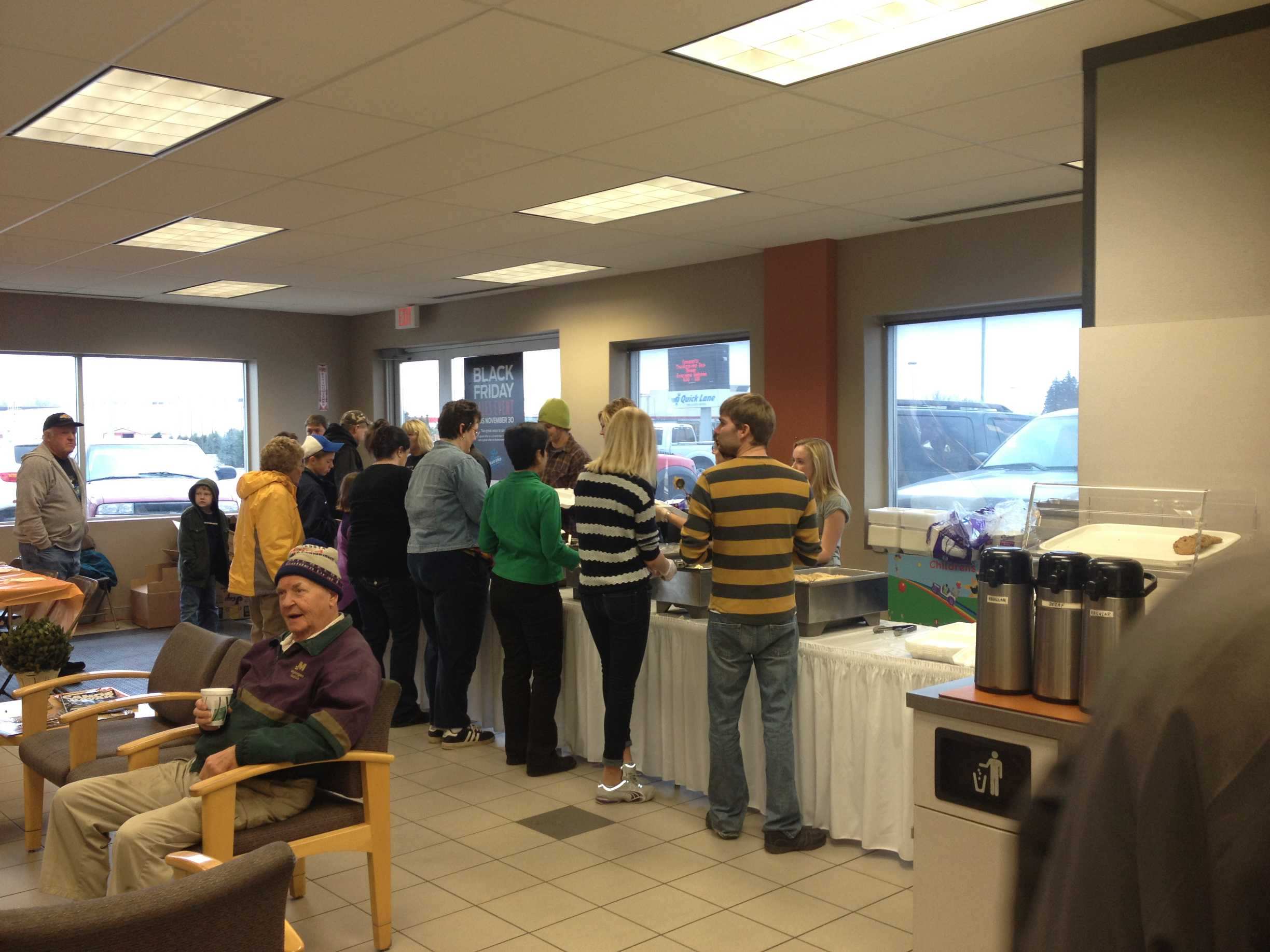 “We really do cook all the food,” Scott Driscoll said. “We cook and slice 24 turkeys the day before. We set up the showroom the night before. We park the cars outside and fill it up with tables and chairs, including all the condiments you would have at home for a meal.”