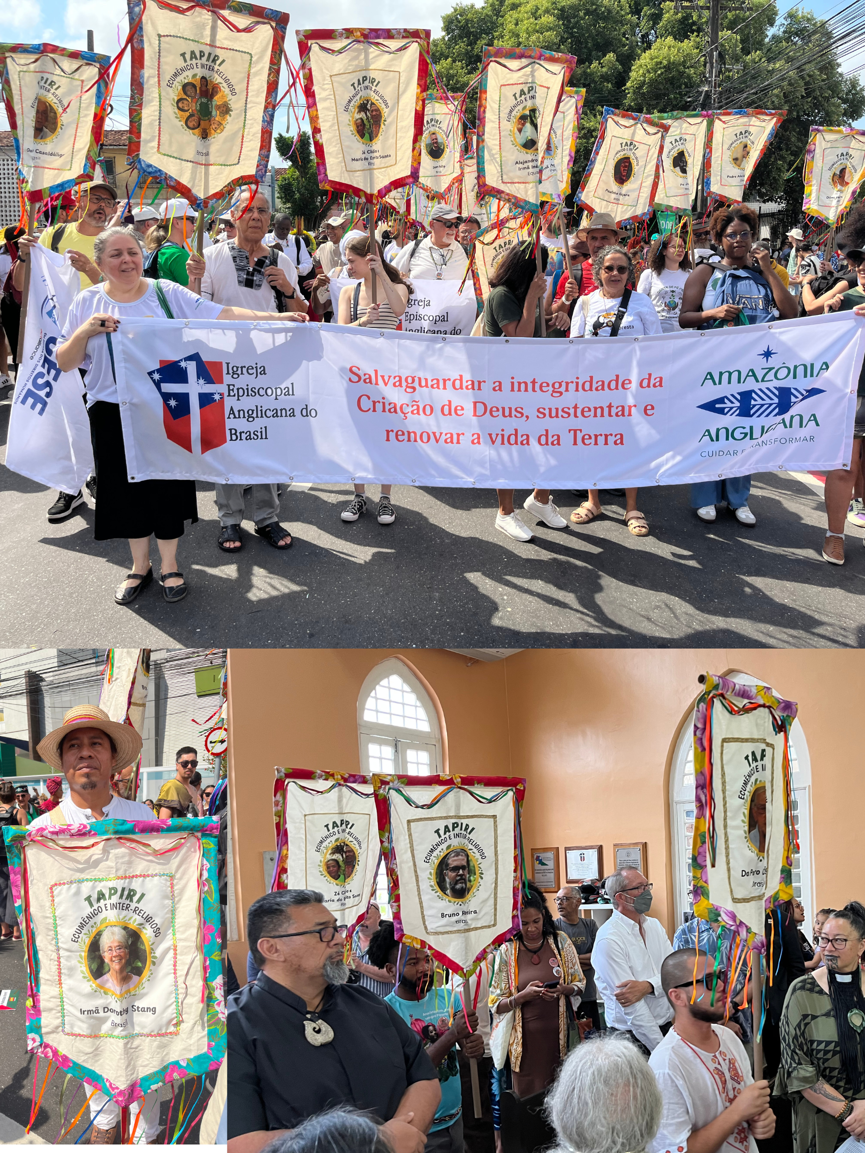 Quilted Anglican banners of climate martyrs killed defending the Amazon are carried during the People’s Climate March and worship service.