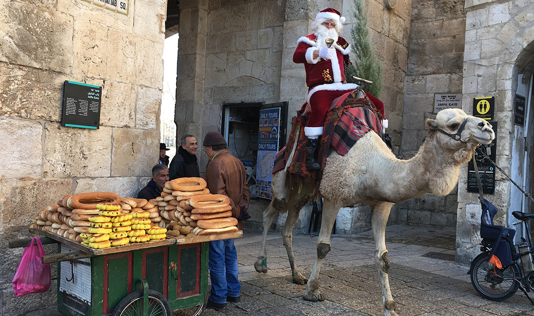 - In front of a Christmas decorations store while smiling in East Jerusalem (a part of the city where mostly Palestinians live, and therefore is underserved and starved of the city’s basic resources).